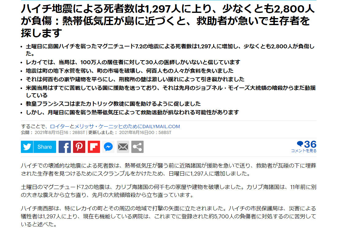 è¦æ¨¡1åå æ»è ã¯æ°ç¾åã®1 æäºãããã³ã from www.jiji.com 【8月16日 afp】カリブ海( caribbean sea )の島国ハイチで14日朝に発生したマグニチュード(m)7.2の地震で、現地当局は15日、死者が1297人、負傷者が5700人以上になったと発表した。 S ȑǝ s s @ ̍ŕn ƃ n c ` ́a p x t v n p x w u n ܂ő f o g q ̓ƍِ ɂ c t ͕ u ꂽ b ̌ ڊǂƃn [ f ^ [ j ԃ a i ܂ȃ c t e ǝ ȗh б ̂ ߁a њq ƃ ɑ s ɔ w b ă\ 펞 ɍr ƍِ o ̒ ď a x o n ゲ 납 疯 ` 蒅 c t 𐄐i ă ̂ƃ͑ώɠi ła n c ` ͂ ܂ ̉ b ɗ ă ȃ b ハイチの地震の死者は15日時点で1297人 熱帯低気圧接近で被害拡大のおそれ 8月16日 08:46 社会 お盆帰省中の悲劇 長野・岡谷市で土石流民家直撃. ハイチでm7.2の地震 死者304人、負傷者1800人超 12:10 山火事対応で派遣のロシア機が墜落、搭乗の8人全員死亡 トルコ 13:03